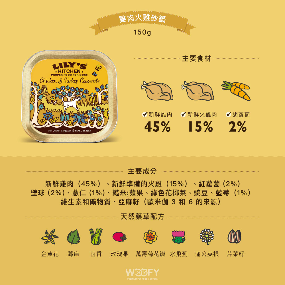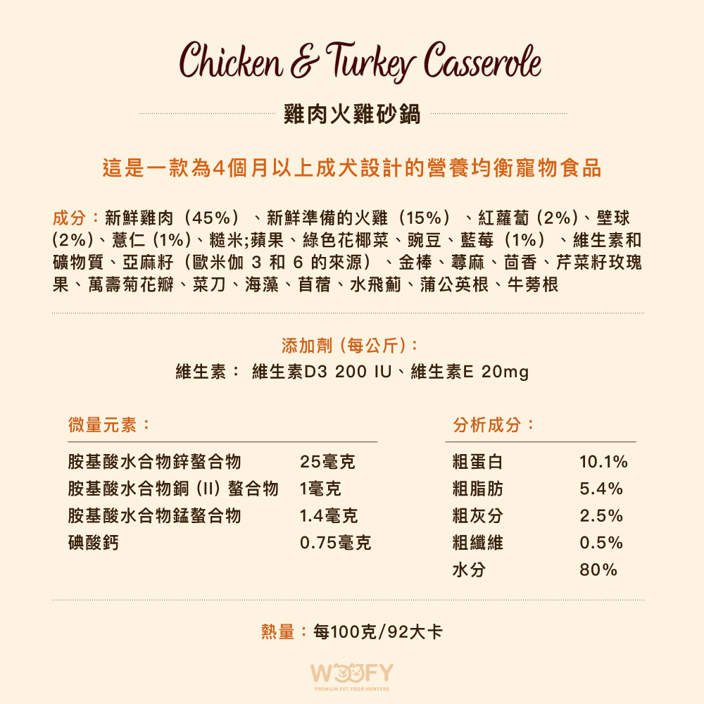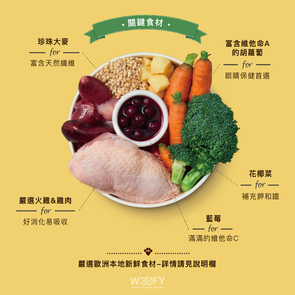 新鮮雞肉(45%)、新鮮準備的火雞(15%)、紅蘿蔔 (2%)、壁球 (2%)、薏仁 (1%)、糙米、蘋果、綠色花椰菜、豌豆、藍莓(1%)、維生素和礦物質、亞麻籽(歐米伽 3 和 6 的來源)。