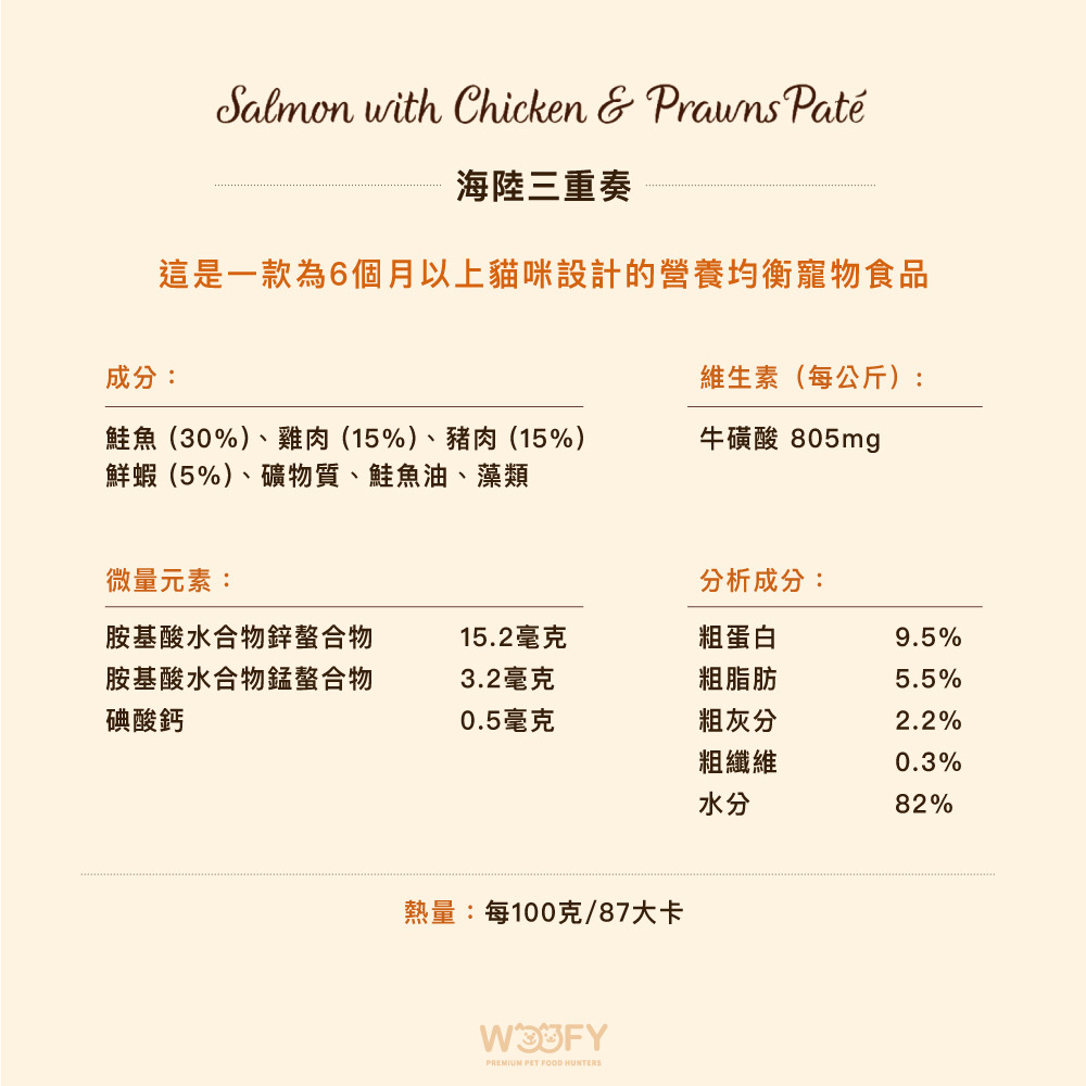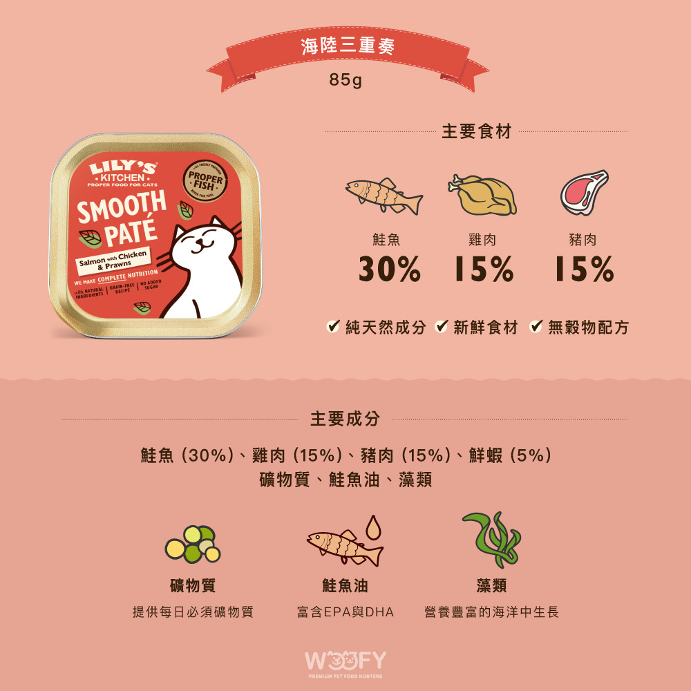 鮭魚 (30%)、雞肉 (15%)、豬肉 (15%)、鮮蝦 (5%)、礦物質、鮭魚油、藻類。