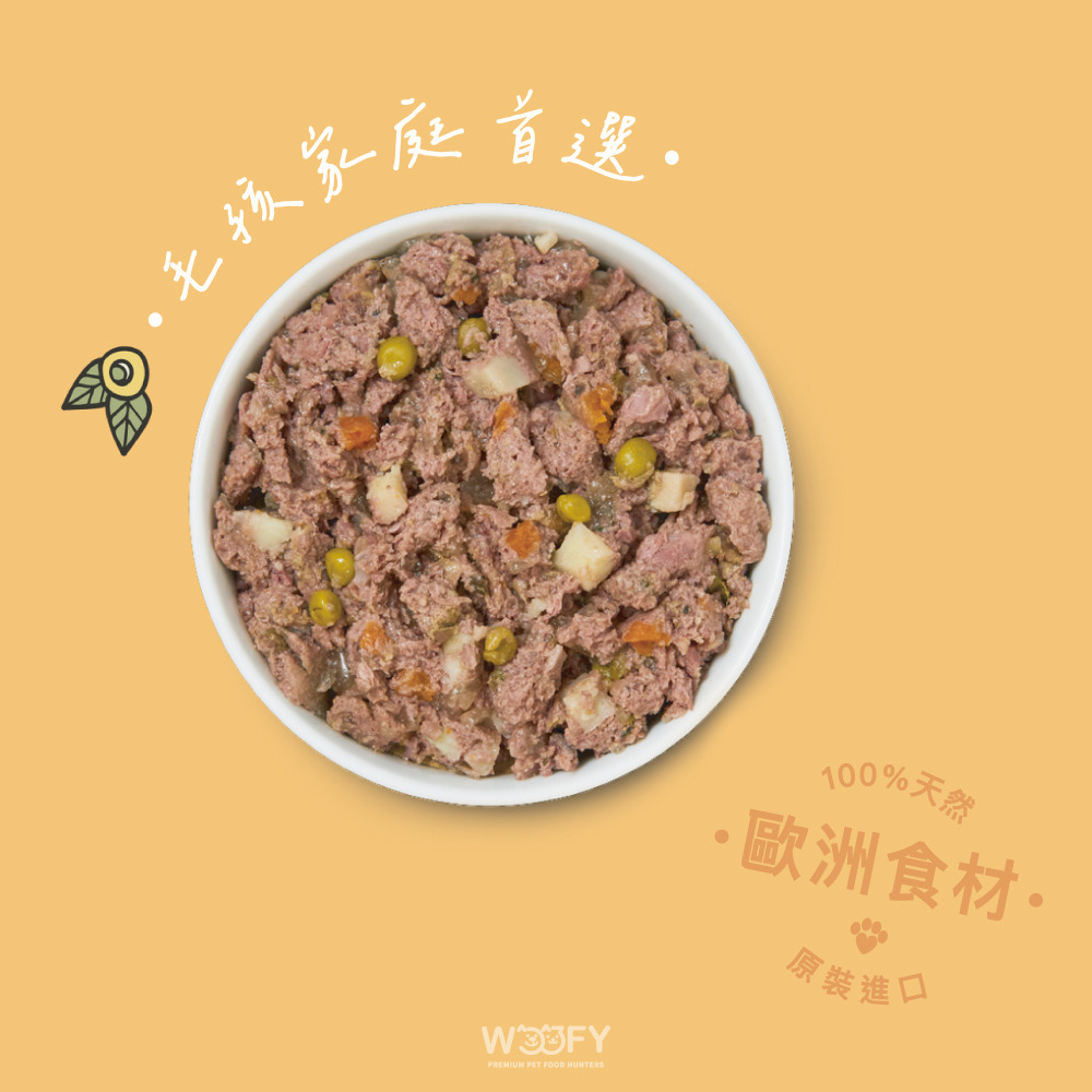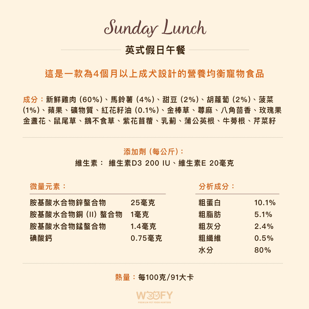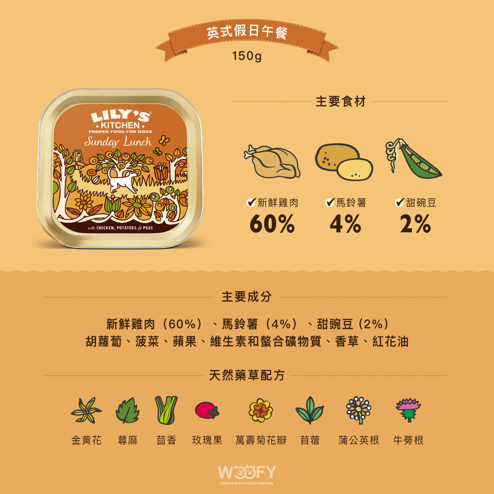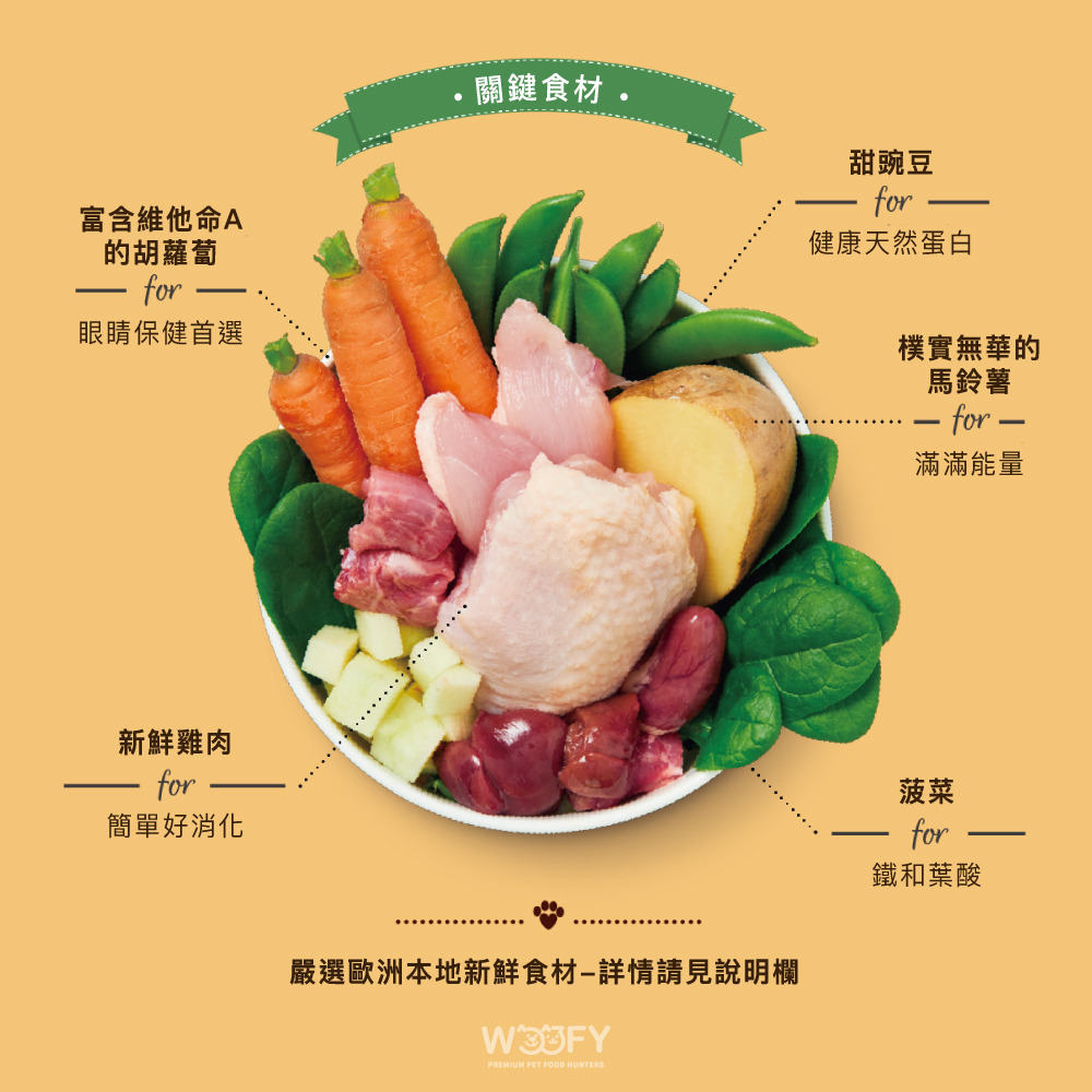 雞肉(60%)、馬鈴薯(4%)、甜豌豆 (2%)、胡蘿蔔、菠菜、蘋果、維生素和螯合礦物質、香草、紅花油