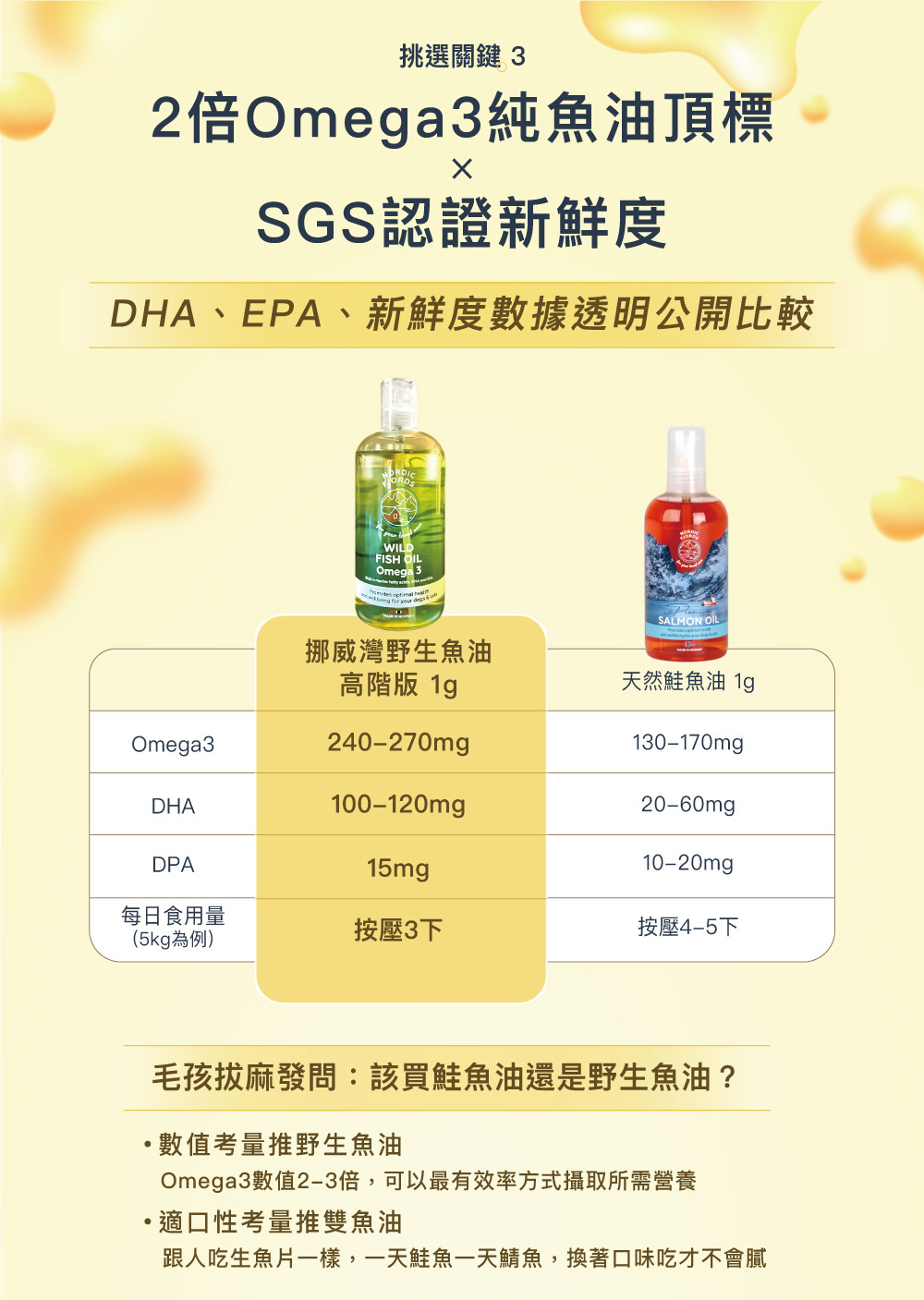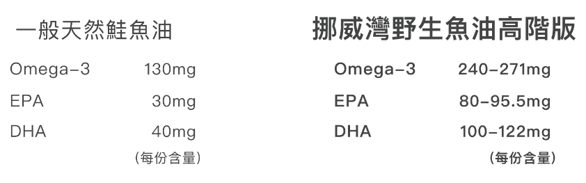 第二:數值不同,野生魚油的Omega3, DHA, EPA皆為鮭魚油的2-3倍,為更高等級的魚油