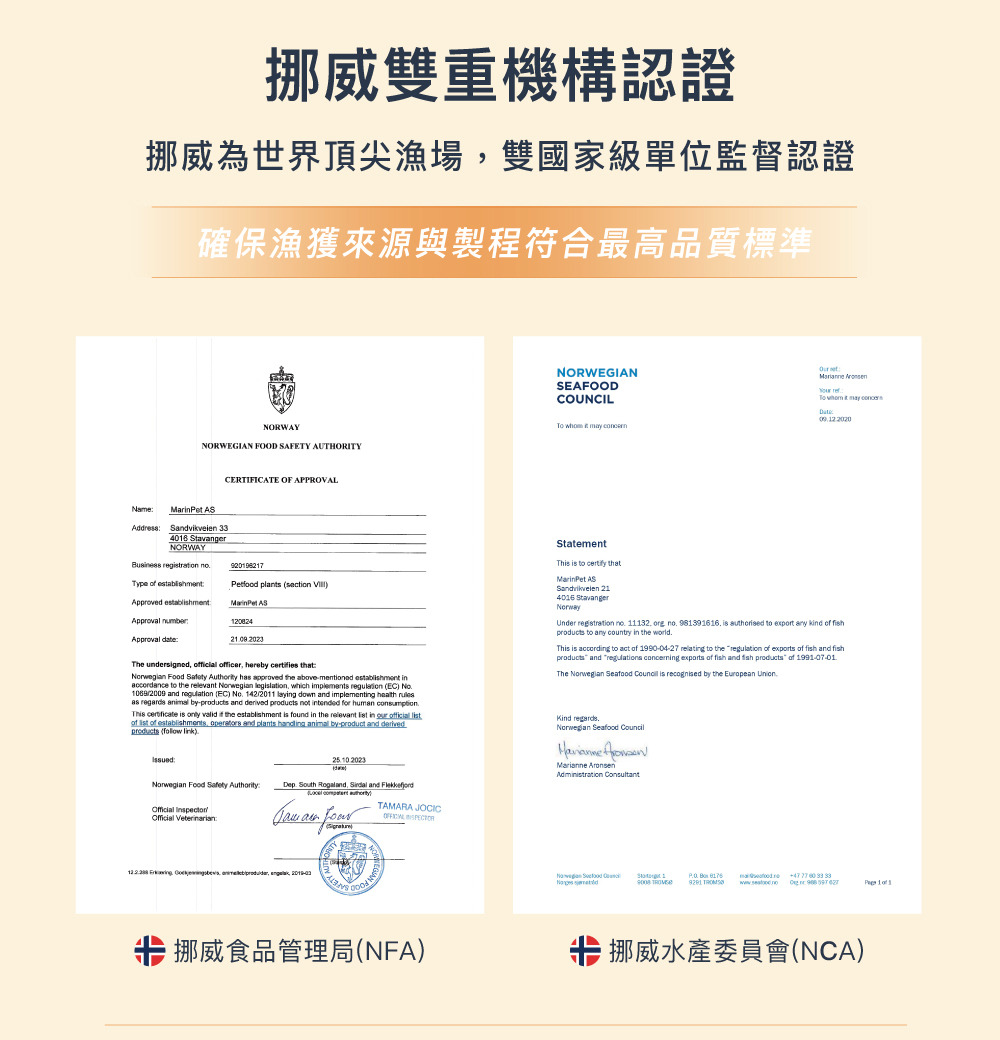 ✅ 通過挪威食品局(NFA)與水產委員會(NCA)核可認證